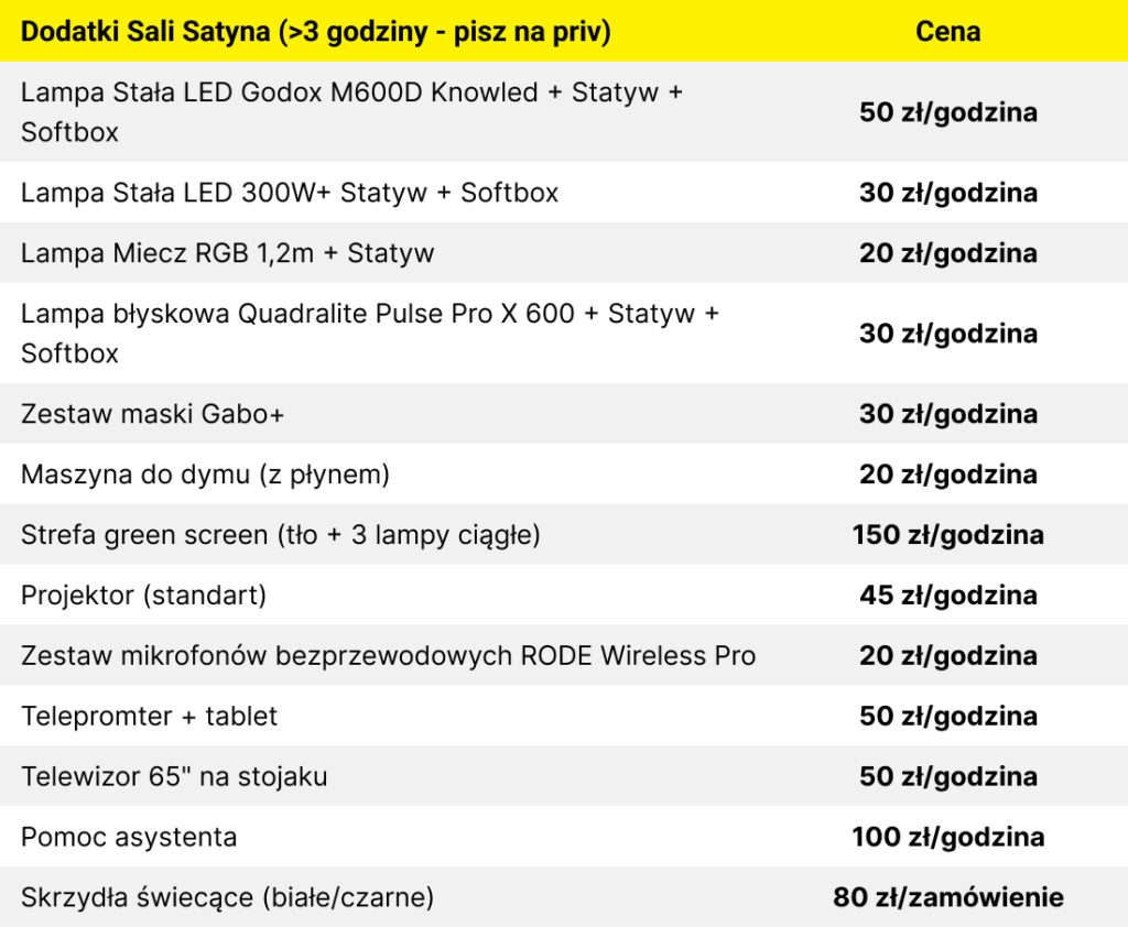W sali Satyna w Warszawie do wynajęcia znajdziesz również nowoczesne wyposażenie, które sprosta wymaganiom nawet najbardziej wymagających fotografów. Nowoczesne lampy statywowe i modyfikatory światła pozwalają na precyzyjne dostosowanie oświetlenia do konkretnego projektu. Wszystkie te udogodnienia, w połączeniu z dekoracyjnymi ścianami i tłami papierowymi, tworzą wszechstronną przestrzeń, w której każdy znajdzie coś dla siebie. Skorzystaj z tej różnorodności i stwórz niepowtarzalne kadry w otoczeniu, które inspiruje do twórczości.