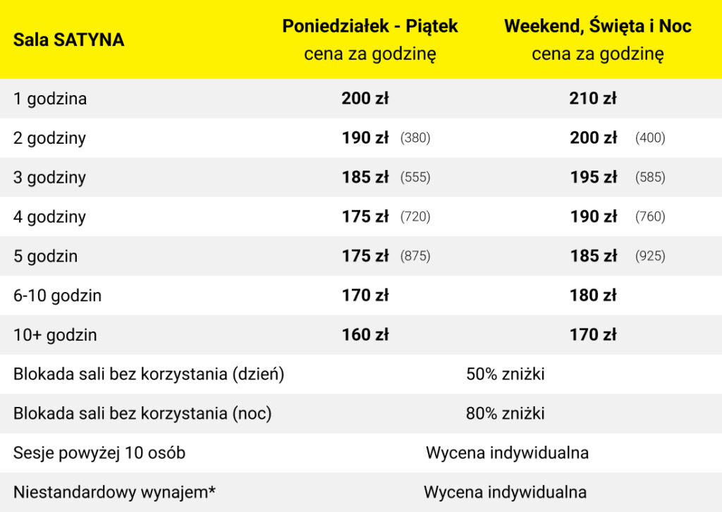 Niestandardowy wynajem to: warsztaty i szkolenia, sesje wielkogabarytowych rzeczy (np. mebli), sesje wymagające dodatkowego sprzątania (sesje z jedzeniem i napojami, konfetti, dymem, mąką) i sesję wymagające dodatkowego zaangażowania ze strony administracji